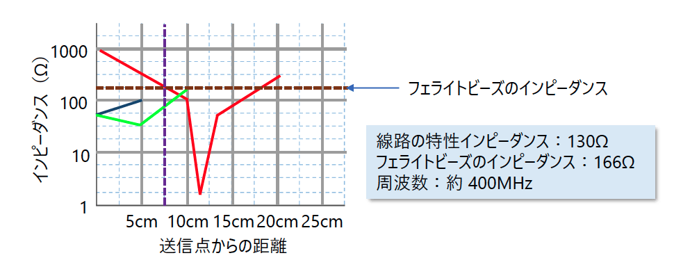 フェライトビーズのノイズ除去効果は、伝送線路長により大きく異なる。要因は、伝送路の両端でインピーダンスマッチングが取れていないと、送受信間で反射が発生し、場所により電圧・電流が異なるためだ(共振等による)。伝送線路の場所により電圧・電流が異なることにより、インピーダンスが異なり効果に差が出る。